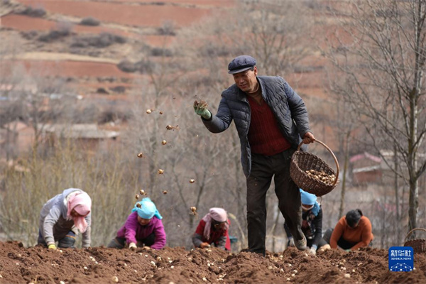 定西市渭源縣元古堆村村民在播撒百合種子(2020年3月11日攝)。新華社記者 馬希平 攝