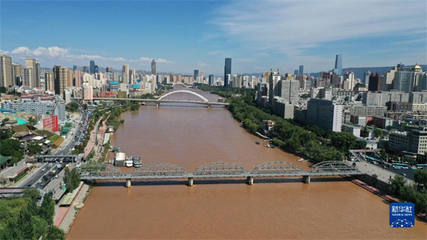 這是黃河蘭州段城市風(fēng)光(2022年9月5日攝,無人機照片)。新華社記者 陳斌 攝