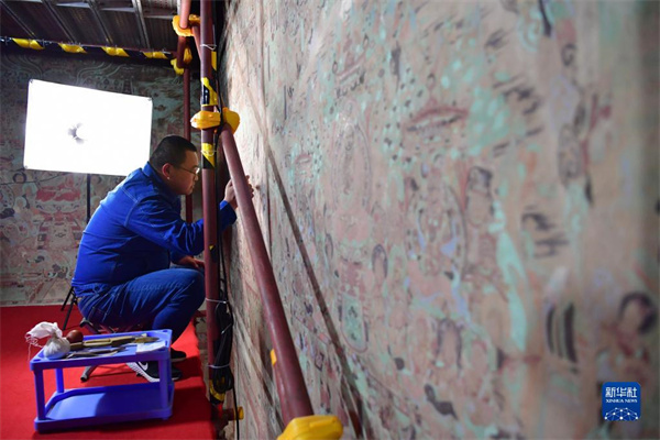 敦煌研究院文物保護技術(shù)服務(wù)中心壁畫修復(fù)師楊金禮在莫高窟第231窟內(nèi)修復(fù)出現(xiàn)病害的壁畫(2022年4月19日攝)。新華社記者陳斌 攝