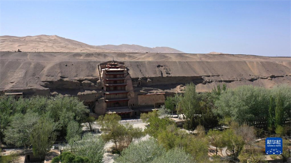 這是世界文化遺產(chǎn)莫高窟的標(biāo)志性建筑——第96窟窟外木構(gòu)建筑九層樓(2022年4月18日攝,無人機照片)。新華社記者 陳斌攝